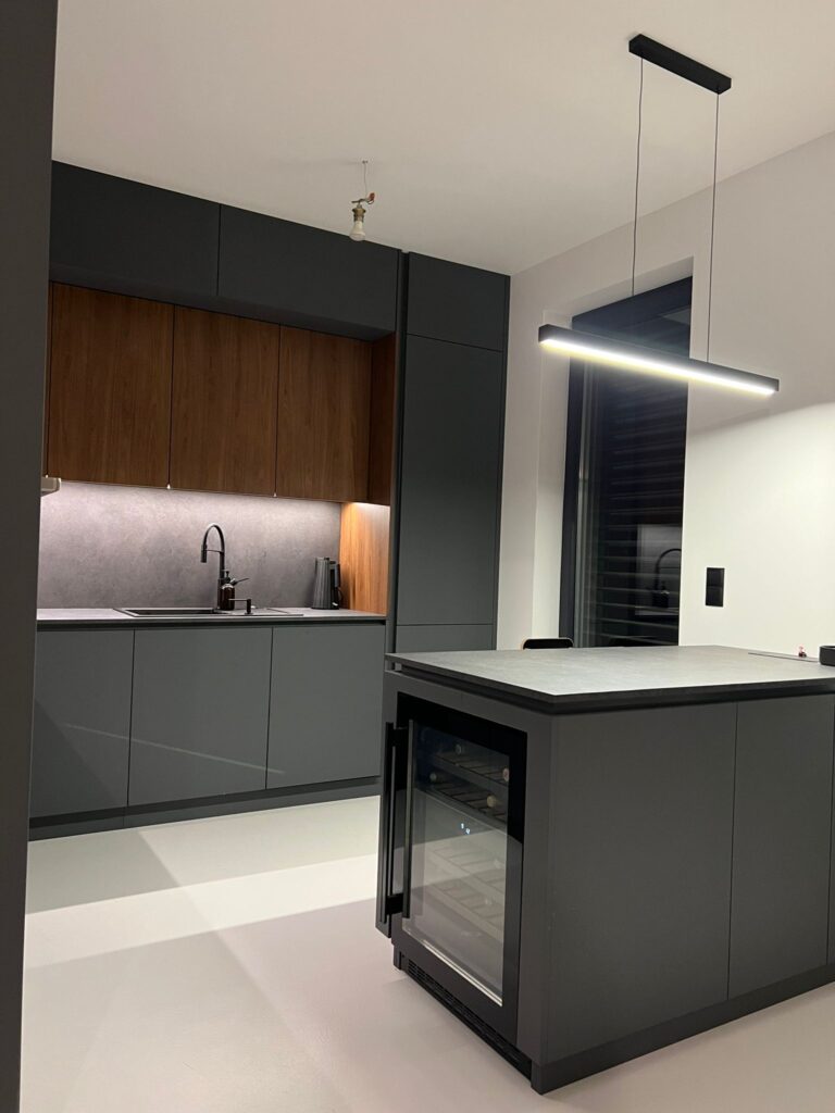Odpowiednie oświetlenie to jeden z najważniejszych aspektów każdej kuchni. W naszym projekcie zadbaliśmy o funkcjonalne źródła światła, które zapewniają komfort użytkowania o każdej porze dnia. Nad drewnianymi szafkami zamontowaliśmy subtelne oświetlenie LED, które doskonale doświetla przestrzeń roboczą. Dodatkowo nad wyspą umieściliśmy nowoczesną, podłużną lampę, która nadaje kuchni wyjątkowy klimat.