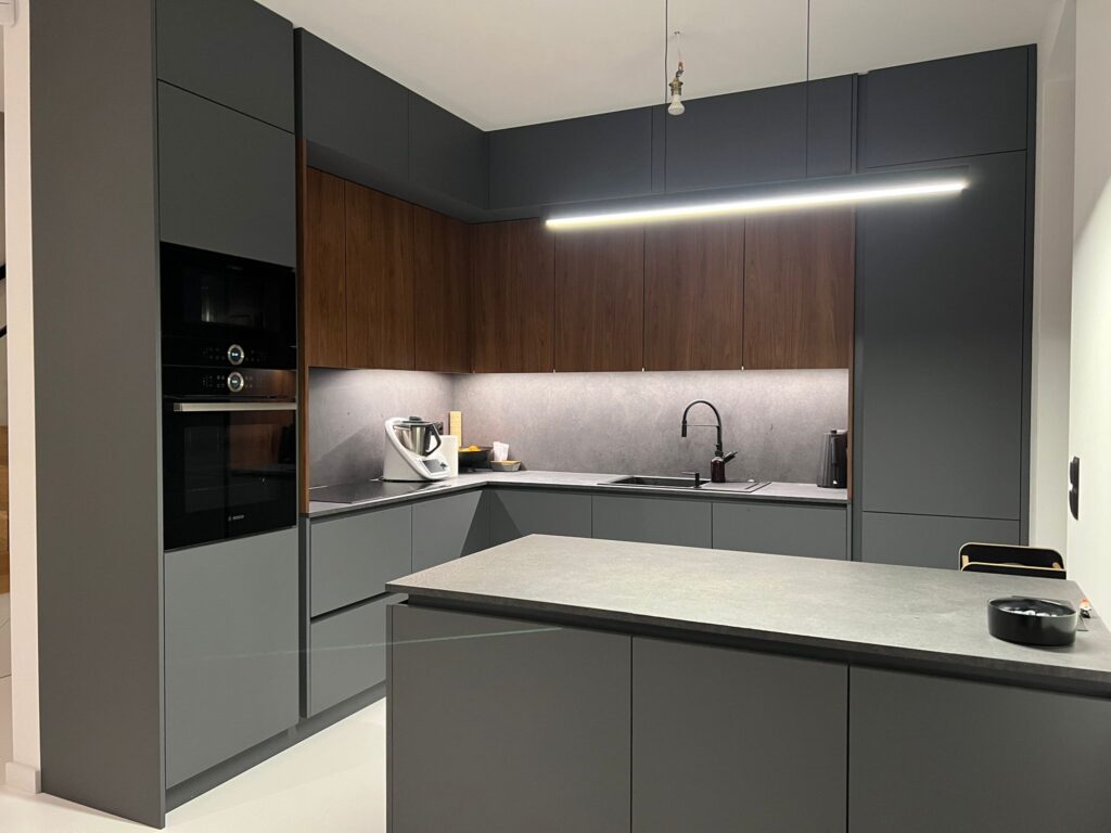 Nasza koncepcja opierała się na zastosowaniu ciemnej szarości w połączeniu z drewnem. Fronty mebli w głębokim, matowym odcieniu grafitu tworzą elegancką i nowoczesną bazę, którą ocieplają drewniane szafki wiszące. To zestawienie nadaje wnętrzu harmonijny balans między surowością nowoczesnego stylu a naturalnym urokiem drewna.